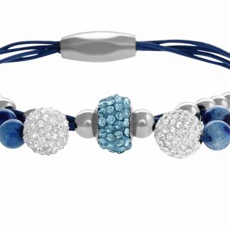 STAINLESS STEEL BRACELET WITH LEATHER & MAGNET LOCK WITH 2 CZ BALLS & S/S BEADS & 4 BLUE BEADS WITH ROUND CZ CHARMS