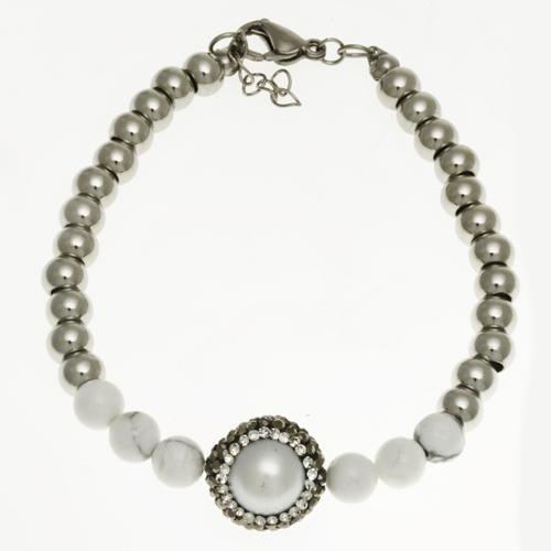 | STAINLESS STEEL BRACELET WITH WHITE PEARL STONE WITH BLACK & WHITE CZ WITH 6 WHITE BEADS & S/S BEADS CHAIN |