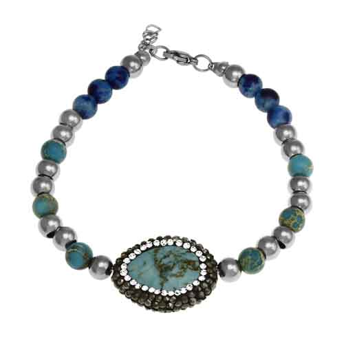 STAINLESS STEEL BRACELET WITH TURQUOISE STONE IN THE CENTER WITH BLACK & WHITE CZ AROUND IT WITH BLUE & S/S BEADS S/S COLOR