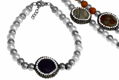 STAINLESS STEEL BRACELET WITH PURPLE OR GREYISH RUST/GREYISH STONE AS CENTER PIECE WITH BLACK & WHITE CZ WITH PEARLS & S/S BEADS S/S COLOR & SOME OTHER BEADS COMBINATION