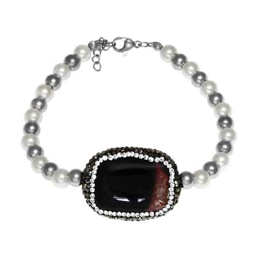 STAINLESS STEEL BRACELET WITH BROWN STONE CENTE PIECE WITH BLACK & WHITE CZ AROUND IT & ALTERNATED PEARLS & S/S BEADSS/S COLOR