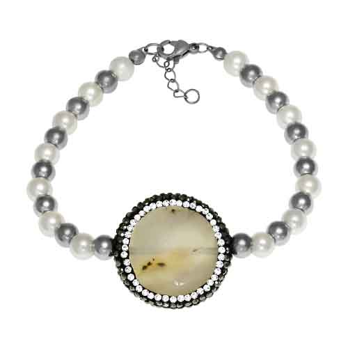 STAINLESS STEEL BRACELET WITH BEIGE/YELLOW STONE CENTE PIECE WITH BLACK & WHITE CZ AROUND IT & ALTERNATED PEARLS & S/S BEADS S/S COLOR
