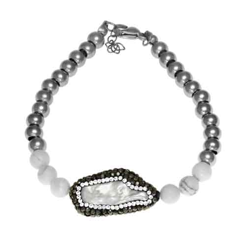 STAINLESS STEEL BRACELET SHELL CENTER PIECE WITH BLACK & WHITE CZ AROUND IT 6 PEARL BEADS & S/S BEADS S/S COLOR