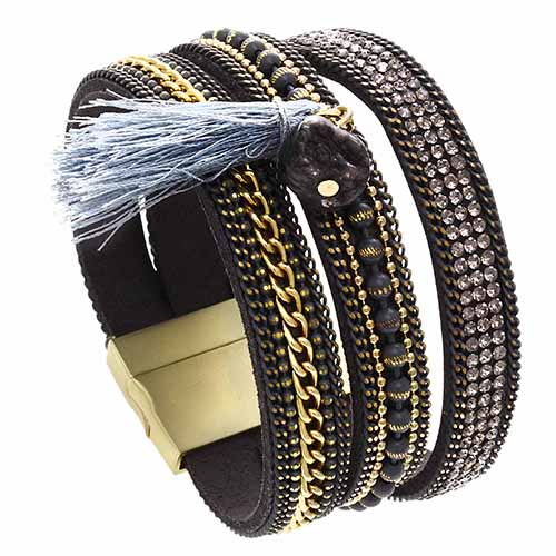 STAINLESS STEEL BRACELET WITH BROWN IMITATIONLEATHER DECORATED WITH DIFFERENT DECORATIVES TEXTURES AND CZ