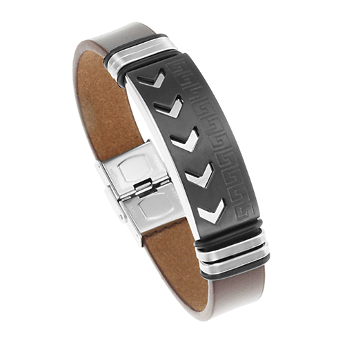 STAINLESS STEEL BRACELET WITH BROWN LEATHER. THE ID PLATE IN IPB TWO TONE