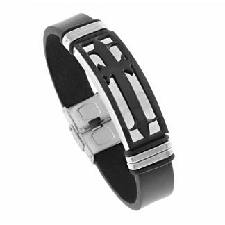 STAINLESS STEEL BRACELET WITH BLACK LEATHER. THE ID PLATE IN IPB TWO TONE