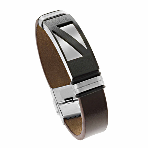 STAINLESS STEEL BRACELET WITH BROWN LEATHER. THE ID PLATE IN IPB TWO TONE