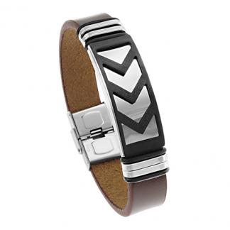 STAINLESS STEEL BRACELET WITH BROWN LEATHER. THE ID PLATE IN IPB TWO TONE