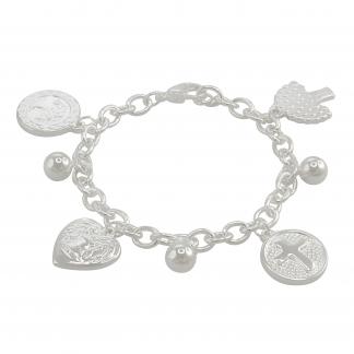 STAINLESS STEEL BRACELET WITH 4 CHARMS IN DIFFERENT DESIGNS AND 3 STEEL BALL IN 8MM. THE HANGING CHARMS SIZES FROM 12MM-18MM WIDTH
