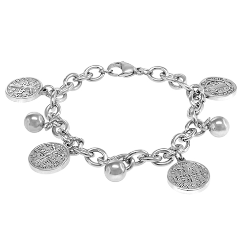 STAINLESS STEEL BRACELET WITH SAN BENITO CHARMS ALL IN SS COLOR.