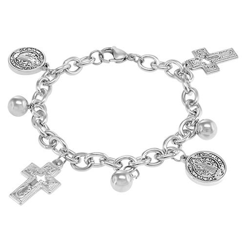 STAINLESS STEEL BRACELET WITH CROSS & SAN BENITO CHARMS ALL IN SS COLOR.