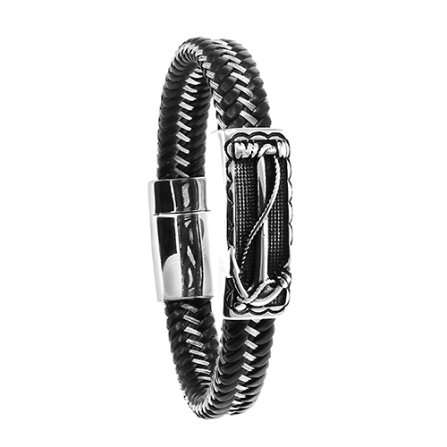 STAINLESS STEEL LEATHER BRACELET WITH ONE ID PLATE IN THE CENTER