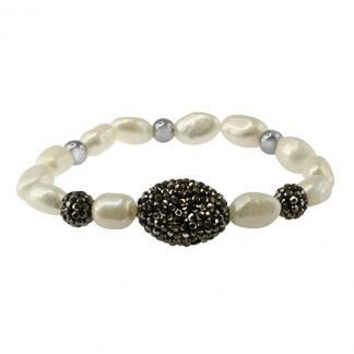 STAINLESS STEEL ELASTIC BRACELET WITH WHITE WATER PEARL & BLACK CZ BALLS