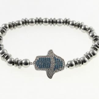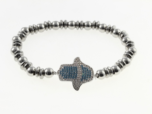 STAINLESS STEEL ELASTIC BRACELET WITH STEEL BEADS AND ONE COPPER HASAM PENDANT IN THE CENTER WITH WHITE AND BLUE ZIRCON