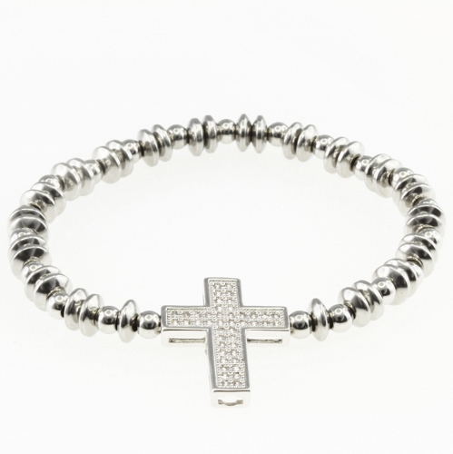 STAINLESS STEEL ELASTIC BRACELET WITH STEEL BEADS AND ONE COPPER CROSS WITH ZIRCON IN THE CENTER