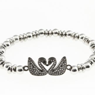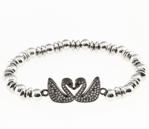 STAINLESS STEEL ELASTIC BRACELET WITH STEEL BEADS AND CENTER WITH 2 SWANS IN BLACK COLOR WITH WHITE ZIRCON