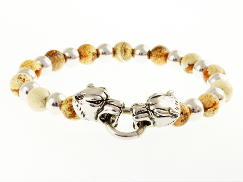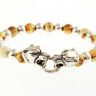 STAINLESS STEEL & TIGER EYES BEADS BRACELET WITH CENTRE TWO PANTER HEADS BRACELET