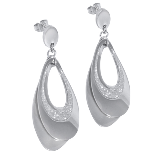 STAINLESS STEEL DROP EARRING WITH 2 LAYERS OF OVAL HANGING CHARM WHITE COLOR WITH SAND BLASTED PAPER