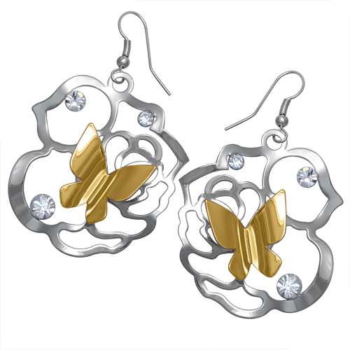 STAINLESS STEEL EARRING WITH BUTTERFLY WITH 3 CZ IN IPG TWO TONE
