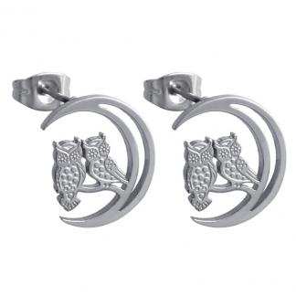 STAINLESS STEEL STUD EARRING WITH OWL COUPLE AND MOON ALL IN STEEL COLOR