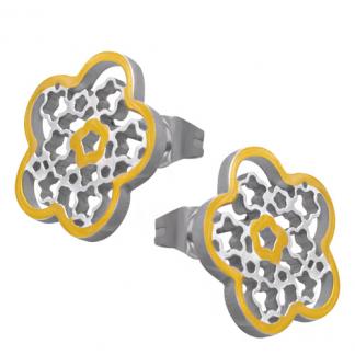 STAINLESS STEEL STUD EARRING IN FLOWER SHAPE WITH FLOWER CUTOUT PATTERN IN IPG TWO TONE