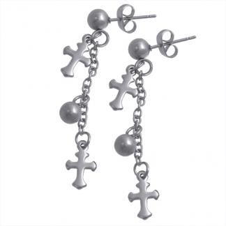 STAINLESS STEEL DROP EARRING WITH 2 CROSS & 1 BEAD ALL IN STEEL COLOR