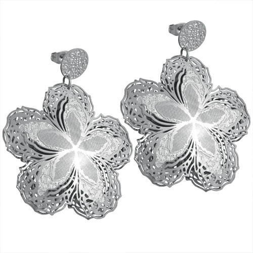 STAINLESS STEEL 3D EARRING IN FLOWER SHAPEWITH LASER PATTERN IN DIFFERENT TEXTURE WITH CUT OUT ALL IN STEEL COLOR
