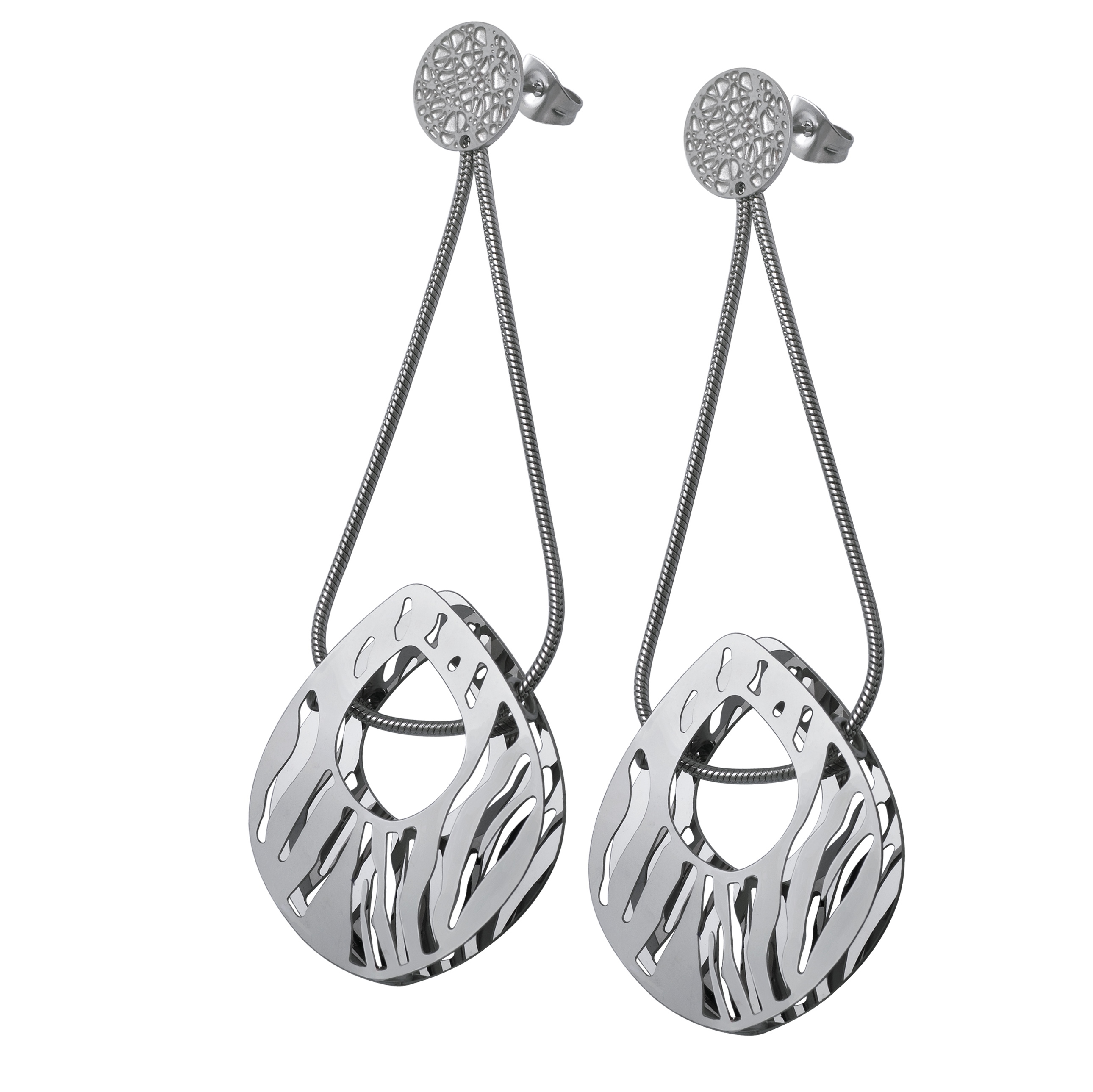STAINLESS STEEL DROP EARRING WITH WATER DROP PIECE WITH ZEBRA PATTERN CUT OUT ALL IN STEEL COLOR