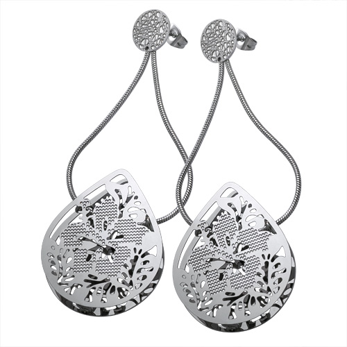 STAINLESS STEEL EARRING WITH WATER DROP PIECE WITH FLOWER PATTERN ALL IN STEEL COLOR