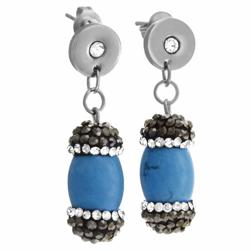 STAINLESS STEEL STUD/DROP EARRING WITH 1 CIRCLE & CZ CENTER PIECE & BLUE STONE LIKE RUGBY BALL WITH BLACK & WHITE CZ AT EACH END ALL IN S/S COLOR