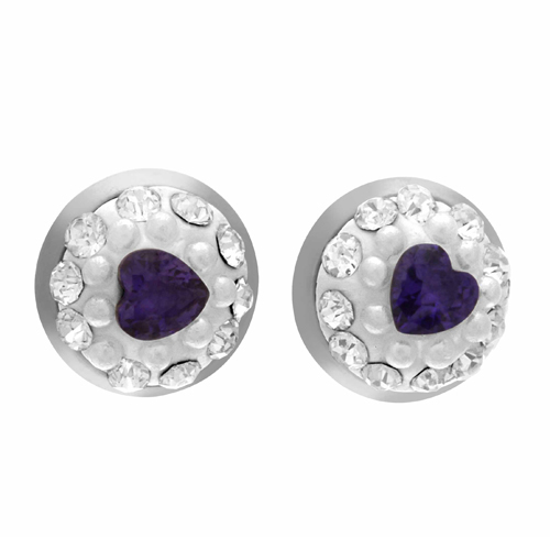 STAINLESS STEEL EARRING CIRCLE SHAPE FILLED WITH MICRO PEARLS WITH A SINGLE LINE OF WHITE CZ AND A HEART CRYSTAL CENTER PIECE (PURPLE OR RED) ALL IN S/S COLOR