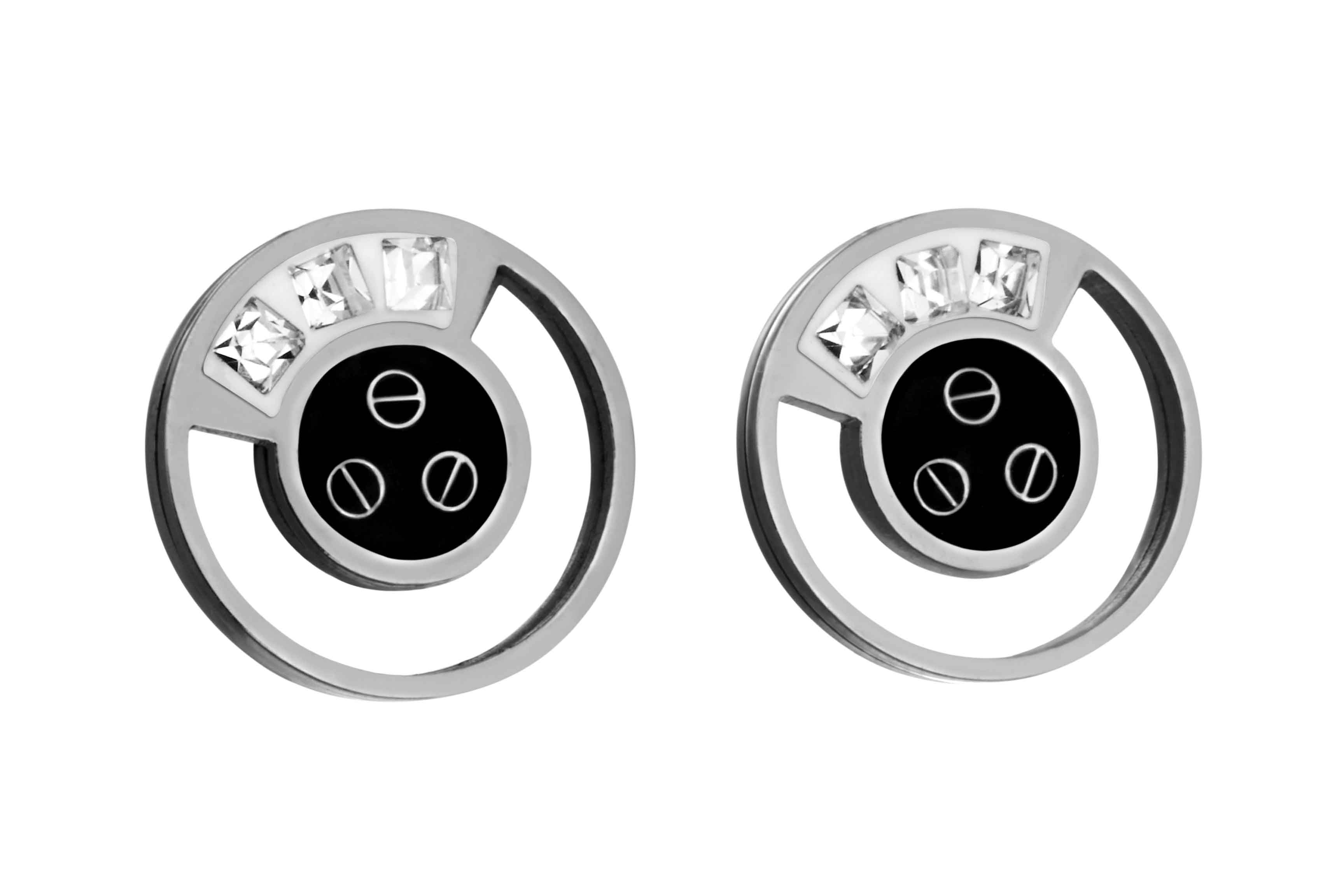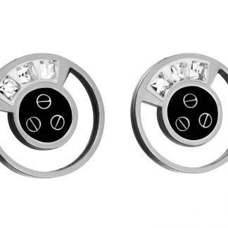 STAINLESS STEEL EARRINGS IN CIRCLE SHAPE WITH CZ AND A SCREW PATTERN IN A BLACK ENAMEL ALL IN S/S COLOR