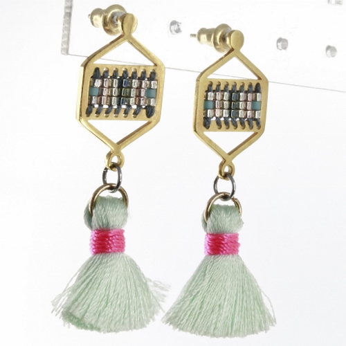 STAINLESS STEEL EARRING WITH BEADS AND COTTON TASSEL. IN IPG COLOR