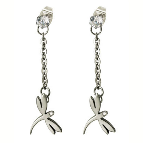 STAINLESS STEEL EARRING WITH DRAGONFLY SHAPE WITH CZ WITH CHAIN ALL IN S/S COLOR