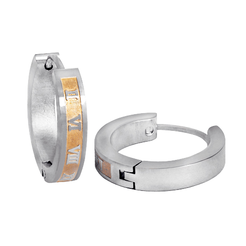 STAINLESS STEEL HUGGIE EARRING IN ROUND SHAPE AND SAND BLAST WITH ROMAN NUMBERS IN IPG TWO TONES