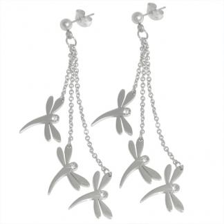 STAINLESS STEEL EARRING DROP EARRING WITH THREE DRAGONFLIES EACH WITH ONE CZALL IN S/S COLOR