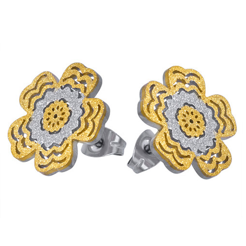 STAINLESS STEEL EARRING IN FLOWER SHAPE WITH SANDBLAST IN IPG TWO TONE
