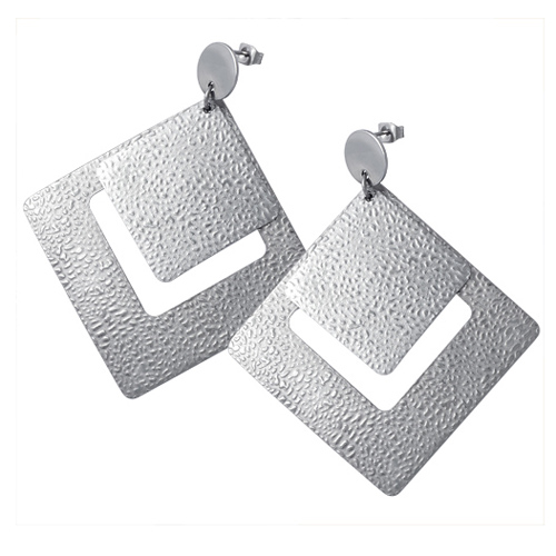 STAINLESS STEEL DROP EARRING WITH 2 RHOMBUS IN SPECIAL TEXTURE (HAMMERED) ALL IN STEEL COLOR