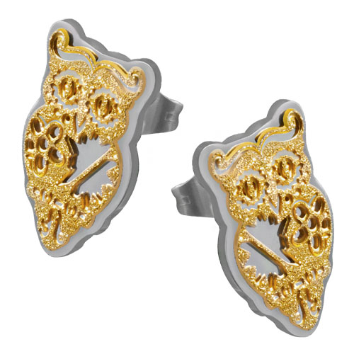 STAINLESS STEEL OWL SHAPE STUD EARRING WITH FLOWER PATTERN IN IPG TWO TONE WITH SANDBLAST