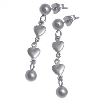 STAINLESS STEEL DROP EARRINGWITH 2 HEART & 1 BEAD All IN STEEL COLOR