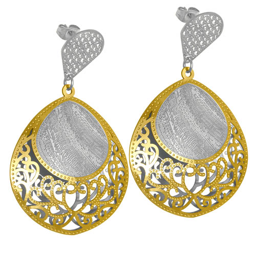 STAINLESS STEEL 3D EARRING IN DROP SHAPE WITH PATTERN WITH CUT OUT IN IPG TWO TONE