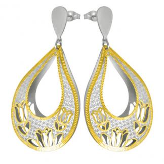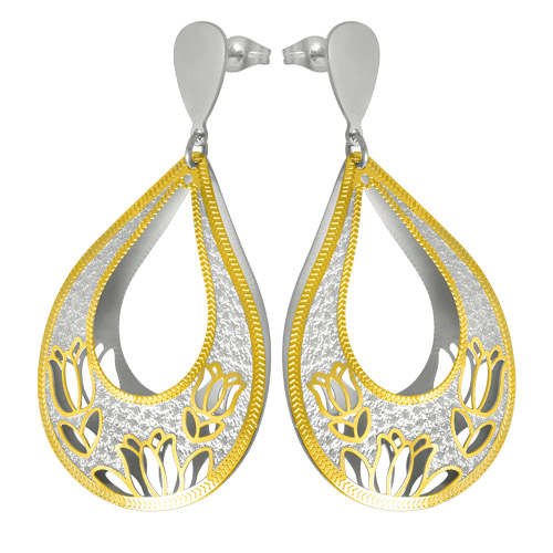 STAINLESS STEEL 3D EARRING IN DROP SHAPE WITH FLOWER PATTERN WITH CUT OUTIN IPG TWO TONE