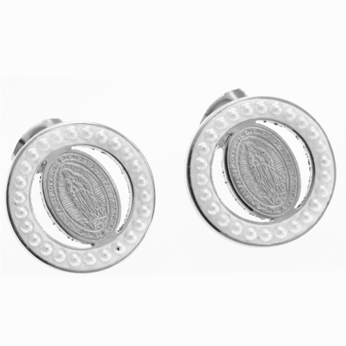 STAINLESS STEEL EARRINGS IN ROUND SHAPE WITH PEARLWITH GUADALUPE LASER PATTERN