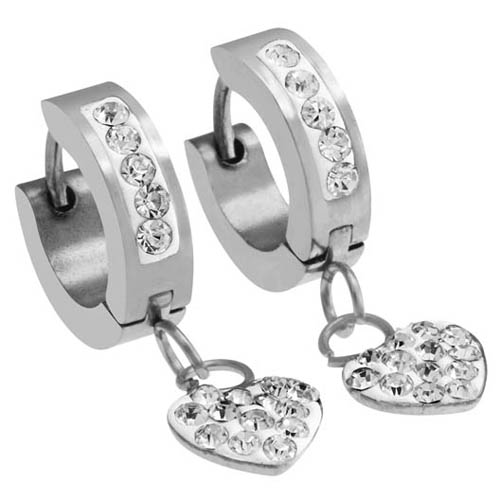 STAINLESS STEEL HUGGIE EARRINGS IN CIRCLE SHAPE WITH CZ WITH HEART CHARMS ALL IN S/S COLOR