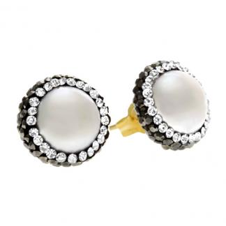 STAINLESS STEEL EARRINGS IN CIRCLE SHAPE WITH A PEARL AND WHITE AND BLACK CRYSTAL ALL IN IPG COLOR.