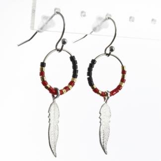 STAINLESS STEEL EARRING WITH BEADS AND ONE LEAF HANGING.