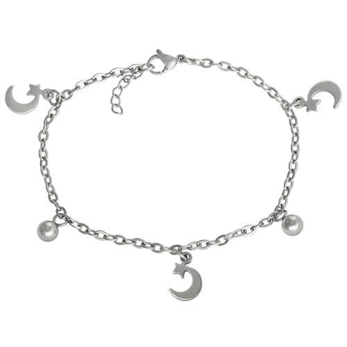 Stainless Steel Necklace In steel color with 2 beads and 3 moon & star charms