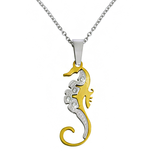 STAINLESS STEEL NECKLACE WITH SEA HORSE PENDANT IN IPG TWO TONE WITH 4 CZ