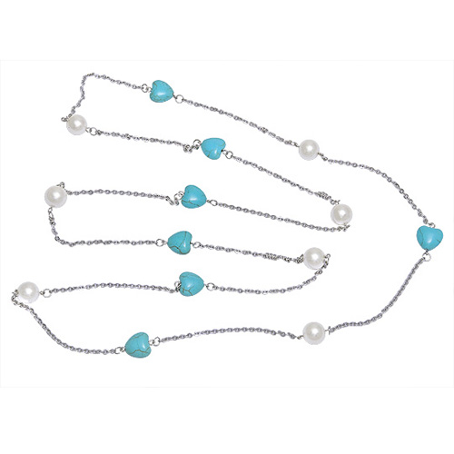 STAINLESS STEEL NECKLACE WITH 7 SYNTHETIC PERALS WITH 7 TURQUOISE STONES IN HEART SHAPE
