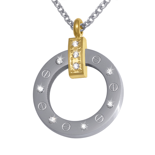 STAINLESS STEEL NECKLACE WITH CIRCLE RING PENDANT & CZ IN IPG 2 TONE